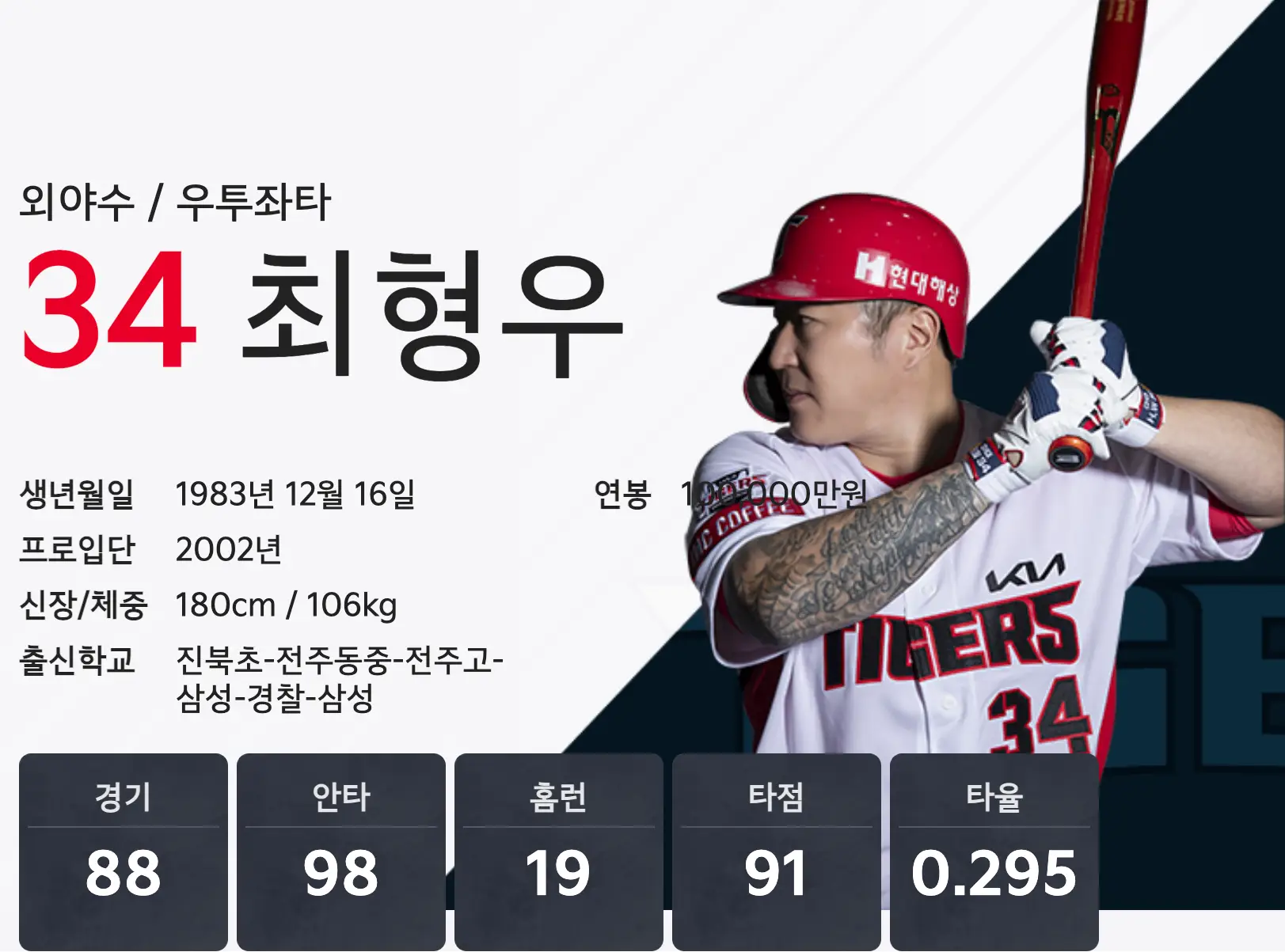 불혹의 나이에도 불구하고 기아 타이거즈 해결사 역할을 도맡아 하는 최형우선수는 올해로 프로인생 22년째를 맞고 있는데요 KBO 최초 1600타점을 돌파하며 새로운 기록을 써 내려가는 기아 최형우선수의 연봉과 프로필 타율등에 대해 알아보겠습니다.