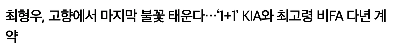 2024년 1월 5일 최형우는 기아타이거즈와 계약기간 1+1년, 연봉 20억 원과 함께 옵션 2억 원 등 총 22억 원에 다년계약을 맺었으며 이는 2024년 옵션 충족 시 2025년 자동연장되는 조건으로 이는 비 FA 역대 최고령 다년 계약의 기록을 남겼습니다.