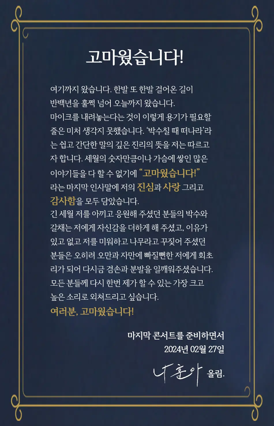 오랜 시간 서민의 애환과 기쁨을 함께 나눠왔던 가왕나훈아 님의 마지막 모습을 볼 수 있는 뜻깊은 시간 부디 예매에 성공하셔서 그의 퇴장에 큰 박수와 응원부탁드립니다.