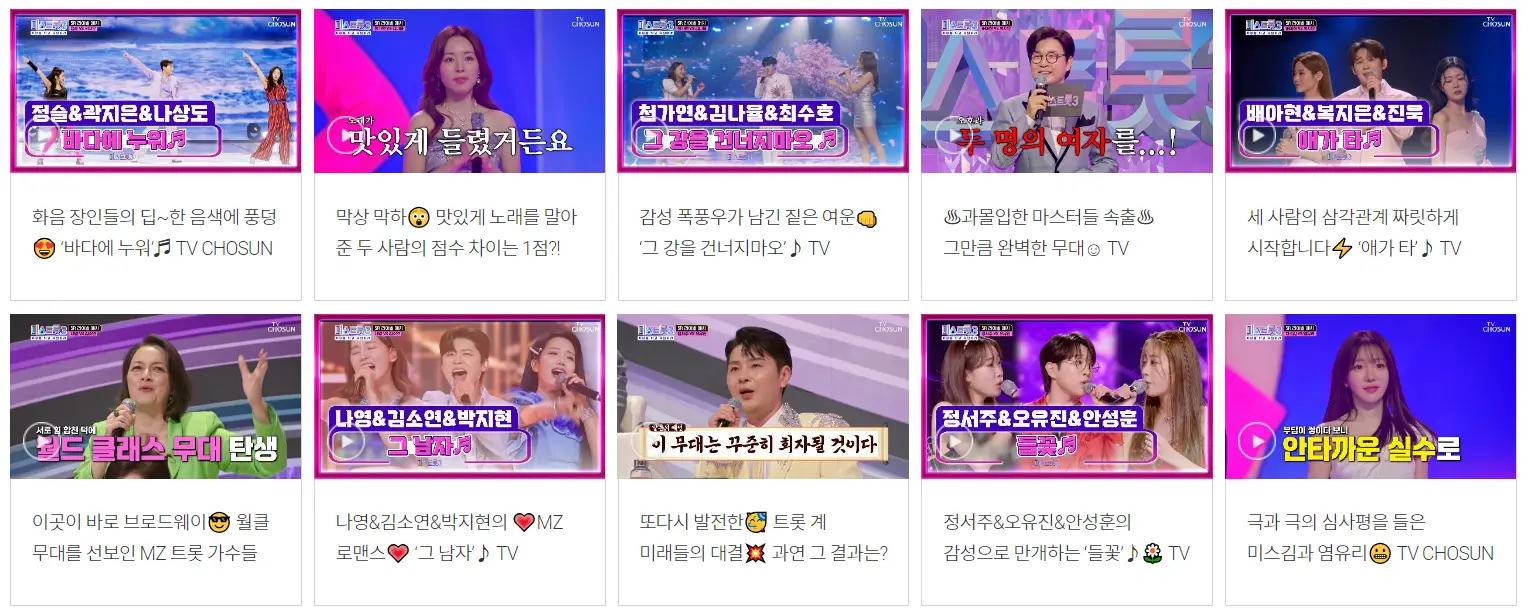 놓쳤던 명장면을 언제든 다시 볼 수 있는 미스트롯 3 명장면 다시 보기로 편한 시간 언제든지 다시 볼 수 있습니다.