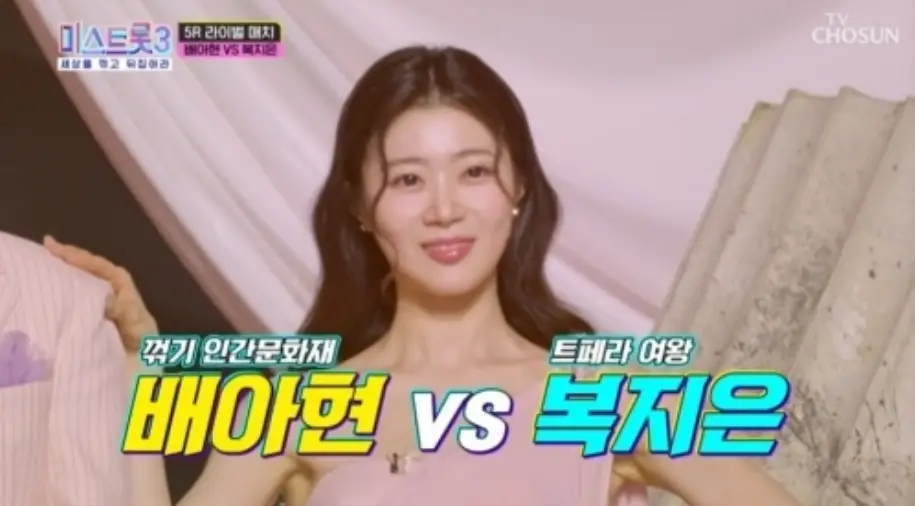 지난 15일 방송에서 드디어 배아현이 1위의 자리를 차지했습니다. 5라운드 1차전은 미스터트롯가수와의 콜라보무대로 결전을 치렀는데요 이번시간에는 배아현과 진욱 그리고 복지은의 삼각대전 콜라보 무대결과와 점수에 대하여 알려드리겠습니다.