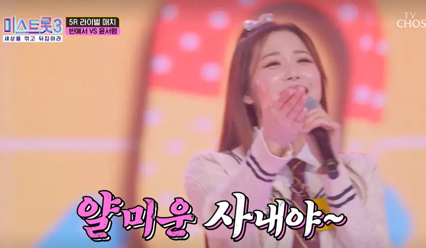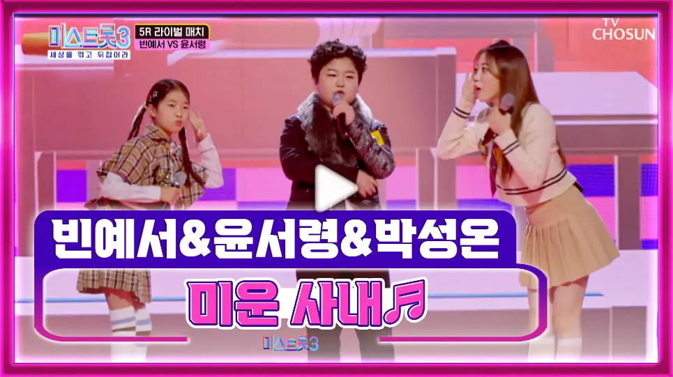 미운사내는 유지나 씨의 경쾌하고 발랄한 트롯곡으로 이날 삼각대전으로 참가한 빈예서, 윤서령, 박성온은 "꽃보다 남자"의 캐릭터를 노래에 녹여내며 한껏 귀엽고 구성력 있는 무대를 선보였습니다.