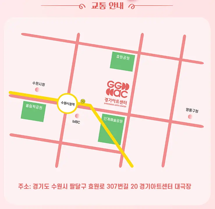 - 분당선 : 수원시청(경기아트센터역) 10번 출구에서 직진 300m