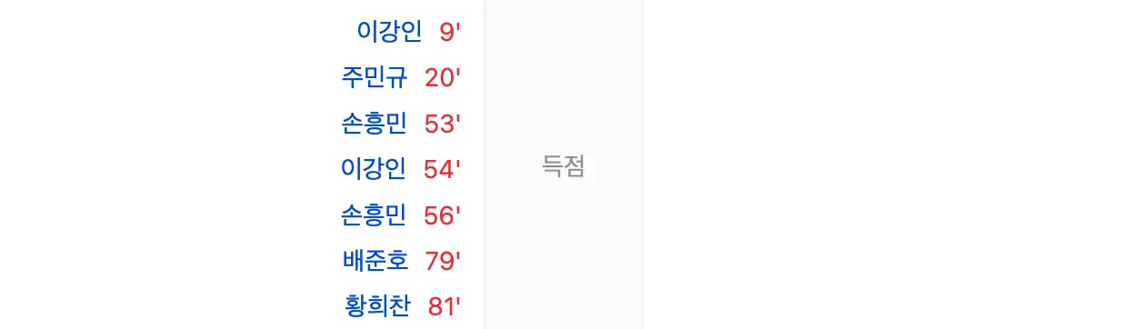 후반 8분 주민규의 패스를 받은 손흥민의 화려한 오른발슈팅으로 시작된 첫 골을 시작으로 후반 9분 이강인의 왼발 슈팅이 후반 2번째 골을 이후 후반 12분 이재성의 패스를 받은 손흥민이 멀티골을 완성했습니다.