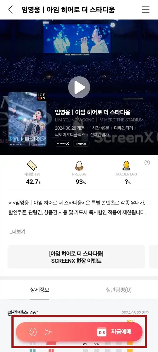 지난 임영웅의 콘서트 아임히어로 더스타디움의 감동을 잊지 못하는 팬들을 위해 CGV에서 임영웅 콘서트를 영화화하여 개봉합니다.