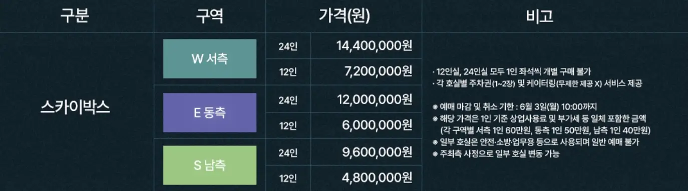 스카이박스와 스카이펍은 단체구매 시 이용할 수 있는 사이트로 5월 30일 오후 7시부터 예매가 가능합니다.