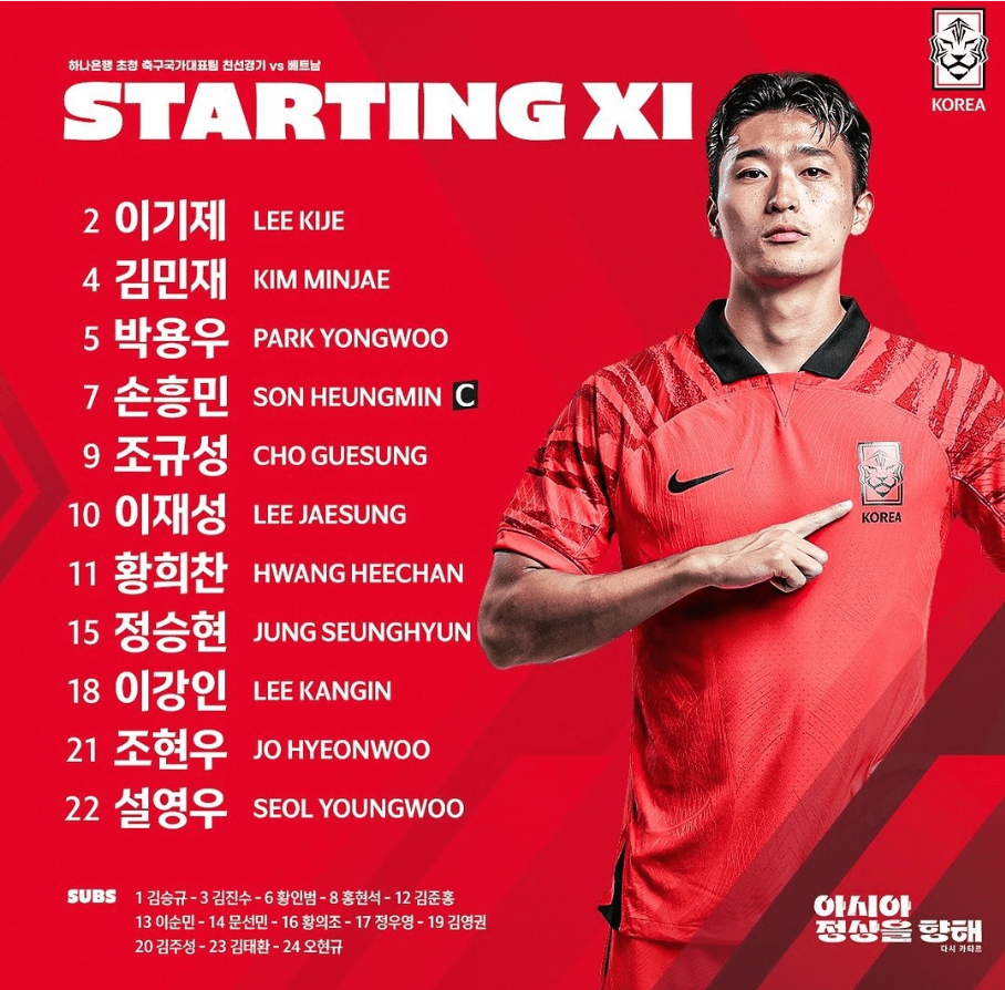 점차 시간은 촉박해지고 한골이라도 얻고 싶던 베트남의 무리한 수비로 인해 퇴장의 실책을 낳고 이미 경기면에서나 실력면에서나 앞서갔던 대한민국 국가대표팀은 후반 25분 손흥민의 패스를 이어받아 이강인의 영리한 왼발슛이 A매치 두 경기 연속골을 터뜨렸습니다.