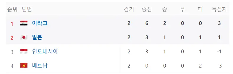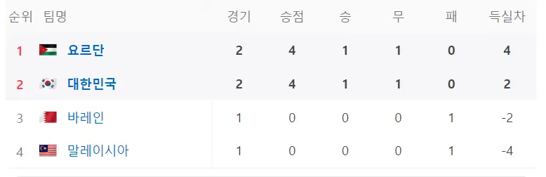 현재 D조 1,2위는 이라크와 일본이 나란히 차지하고 있으며 대한민국이 말레이시아와 경기에서 승리 또는 적어도 무승부만을 기록해도 다음 리그 진출이 가능합니다.