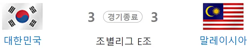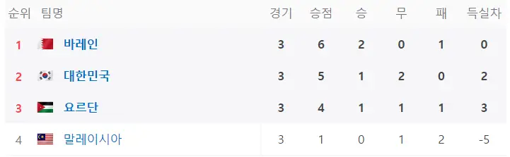 예선경기를 모두 마친 현재 E조의 1위는 바레인 2위는 대한민국 3위는 요르단순이며 말레이시아는 아쉽게 탈락의 고배를 마시게 되었습니다.