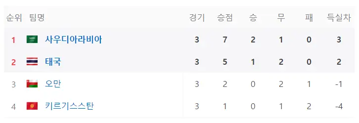 F조역 시 모든 예선전을 마쳤으며 1위 사우디아라비아와 2위 태국이 16강 진출에 성공했으며 오만과 키르기스탄은 탈락하였습니다.