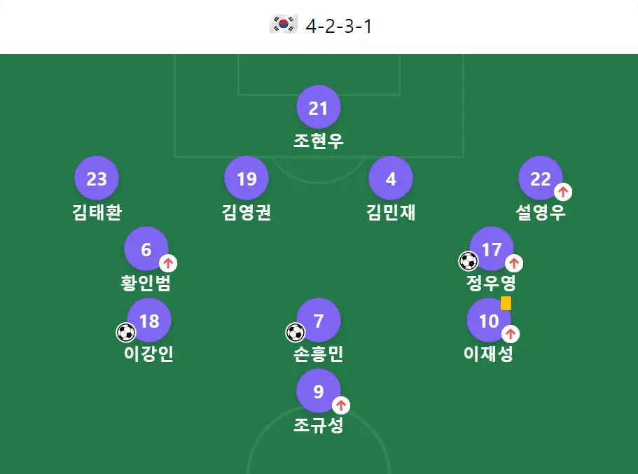 경기초반 대한민국은 손흥민, 김민재, 이강인 등 대한민국의 대표적인 선수들을 대거기용하여 4-2-3-1 배열을 이용하여 경기의 주도권을 잡았습니다. 강한 압박과 빠른 전환 압도적인 볼점유율과 2배가 넘는 총 12회의 유효슈팅은 그 진가를 발휘하기 턱없이 부족했습니다.