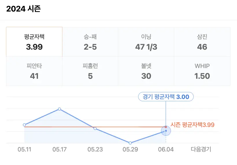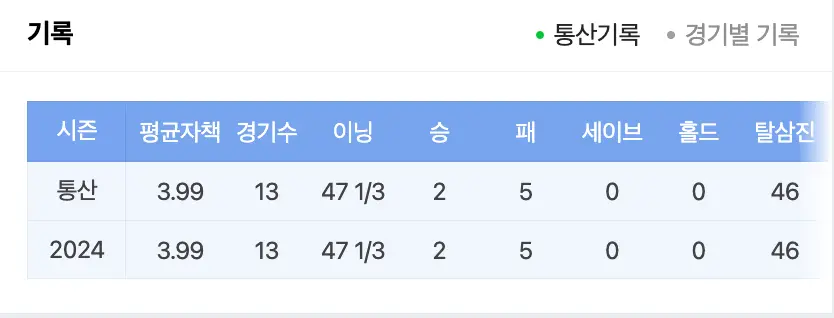현재 총 13경기 2승 5패 3.99의 자책점을 기록하며 큰 활약을 보이고 있지는 못하고 있습니다.