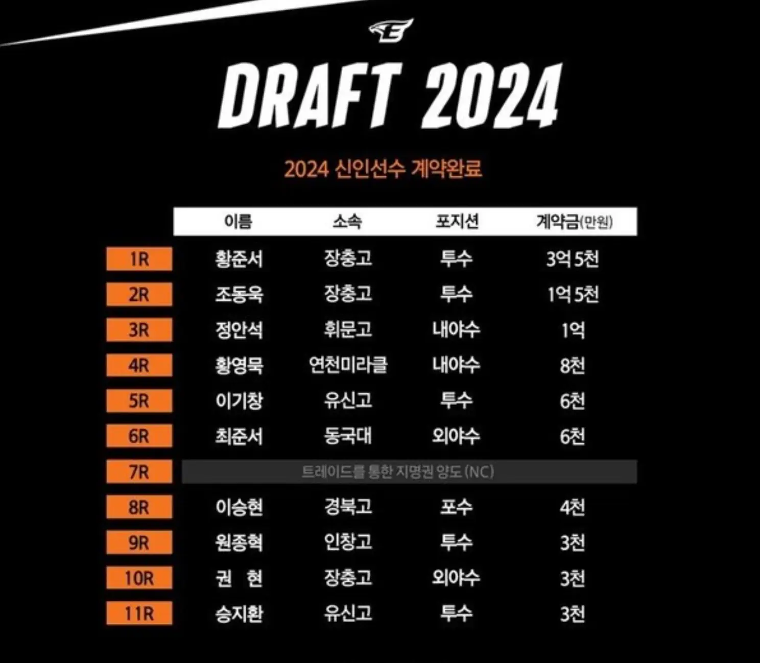 한화 이글스는 2024 KBO 신인드래프트 1라운드 1순위로 장충고등학교 출신의 황준서선수와 3억 5000만 원에 체결했습니다.