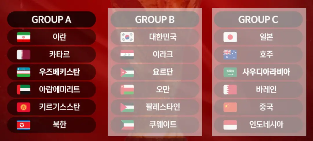 다행히 FIFA 랭킹 22위 한국은 55위 이라크, 68위 요르단, 76위 오만, 95위 팔레스타인, 137위 쿠웨이드와 같이 그룹 B조에 편성되었습니다.